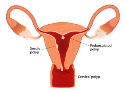 Polyps are benign growths which develop on the inside lining of the uterus. They are typically benign (non-cancerous) and can occur in women of all ages. The cause of uterine polyps is uncertain.